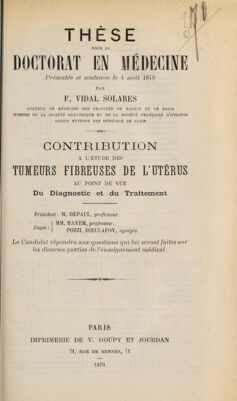 Contribution à l'étude des tumeurs fibreuses de l'utérus au point de vue du diagnostic et du traitement ... / par F. Vidal Solares.