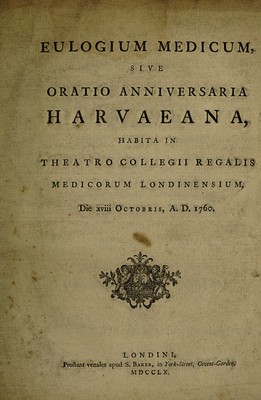 Eulogium medicum, sive oratio anniversaria Harvaeana, habita in theatro Collegii Regalis Medicorum Londinensium, die xviii Octobris, A.D. 1760.