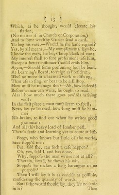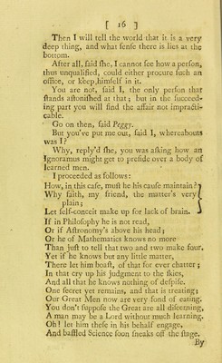 ![l^reet, but the cry is,—There goes one of Snip’s boarders. Peggy figh’d and ihook her head. Moreover, continued I, we fhould nowferioufly rei]ec5f, that poffibly future connei5lions may be productive of a rifing generation. Peggy fmil’d and fhook her tail. I then open’d to her my fcheme of a new pup- pet-fhiow.—Don’t think, my dear, faid I, that you are to fit and interpret Punch’s ribaldry to the company.—No.—You will have nothing to do, but by day to amufe yourfelf with your fa- vorite authors; and at night to fit and take mo- ney. The former part of this lafi: fentence fuited Peggy^s, humour much; and for the latter part, I never knew a woman that had any objection to it. Now, fays I, in order to fucceed in this affair, we muff hit upon fomething new, to at- tract the attention of the public.—And whereas the Royal Family has been fhewn to advantage in wax-work, my defign is to exhibit the R—1 S—ci—y in wood-work; and herein to give all that tribute of merit due to the prefent worthy Prefident, a man who, take him all in all, “ We ne’er fhall look upon his like again.” And fo long as he is fupported by the Nobility of the kingdom, he will, I doubt not, fiand his ground againft all the Philofophers, Mathema- ticians, Phyficians, and Affronomers in the nation. He certainly is a great traveller, and fo very learned in the tefiaceous part of the creation, C 2 xhat](https://iiif.wellcomecollection.org/image/b28765199_0019.jp2/full/800%2C/0/default.jpg)