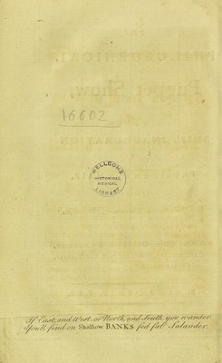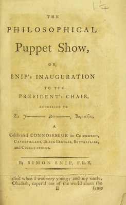 The philosophical puppet-show, or, Snip's inauguration to the President's Chair : addressed to Sir J[oseph] B[anks], barōnetos, a celebrated conoisseur in chickweed, caterpillars, black beetles, butterflies and cockle-shells / By Simon Snip [pseud].