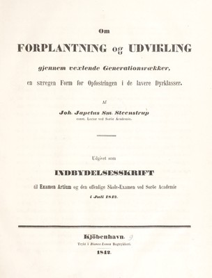 Om forplantning og udvikling gjennem vexlende generationsraekker. En særegen form for opfostringen i de lavere dyrklasser / Af Joh. Japetus Sm. Steenstrup ... Udgivet som indbydelsesskrift til examen artium og den offentlige skole-examen ved Soröe academie i juli 1842.