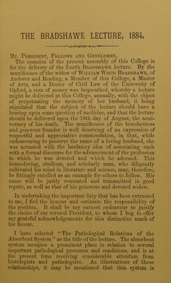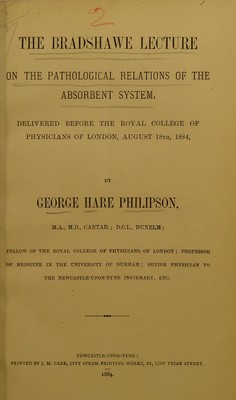 The Bradshawe lecture on the pathological relations of the absorbent system : delivered before the Royal College of Physicians of London, August 18th, 1884 / by George Hare Philipson.