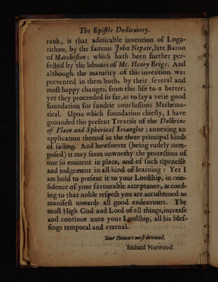 Trigonometrie. Or, the doctrine of triangles: divided into two books. The first shewing the mensuration of right lined triangles: the second of spherical ... Both performed by that late and excellent invention of logarithms ... Whereunto is annexed (chiefly for the use of sea-men) a treatise of the application thereof in the three principal kinds of sailing. With exact tables of the suns declination ... and tables of the right ascension and declination of some eminent fixed stars ... Also other necessary tables used in navigation / [Richard Norwood].