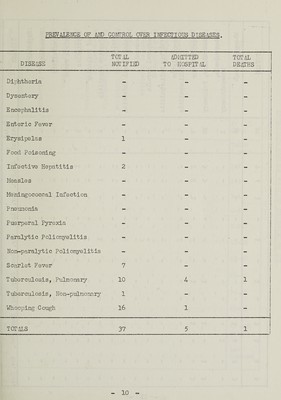 ![DEATHS FROM ALL CAUSES, I960. The Table below was compiled from figures supplied by the Registrar- [eneral and the classification is given under the thirty-six headings based on [he Abbreviated List of the International Statistical Classification of liseases, Injuries and Causes of Death, 1948. Cause of Death Male Female 1. 2. r 4. 15. 16 7 Tuberculosis, respiratory Tuberculosis, other Syphilitic disease Diphtheria Whooping Cough Meningococcal infections Acute Poliomyelitis 1 IS. Measles |9. Other infective and parasitic diseases lo. Malignant neoplasm, stomach L, Malignant neoplasm, lung, bronchus 12. Malignant neoplasm, breast 13. Malignant neoplasm, uterus [4. Other malignant and lymphatic neoplasms 15. Leukaemia, aleukaemia 16. Diabetes [7. Vascular lesions of nervous system 18. Coronary disease, angina [9. Hypertension with heart disease b. Other heart disease |l. Other circulatory disease ]2. Influenza |3. Pneum.onia 14. Bronchitis 5. Other diseases of respiratory system 16. Ulcer of stomach and duodenum 7. Gastritis, enteritis and diarrhoea 3. Nephritis and nephrosis p. Hyperplasia of prostrate p. Fregnancy, childbirth and abortion 1. Congenital malformations 2. Other defined and ill-defined diseases 3. Motor vehicle accidents +. All other accidents 15. Suicide p, Homicide and operations of war 2 4 2 1 1 7 9 2 4 4 1 4 4 1 1 7 3 2 1 1 4 1 7 1 9 8 6 1 3 1 1 4 2 All causes 59 51 S](https://iiif.wellcomecollection.org/image/b30287194_0013.jp2/full/800%2C/0/default.jpg)