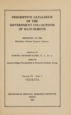 Descriptive catalogue of the government collections of manuscripts depositied at the Deccan college, Poona / comp. by the assistant to the professor of Sanskrit, Deccan college, Poona.
