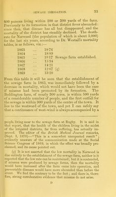 Some points in the physiological and medical aspect of sewage irrigation : the second edition of a paper read at the Social Science Congress, at Bristol, Oct. 2, 1869, with notes upon the recent evidence adduced against irrigation in the Houses of Parliament, &c. : to which is also appended, a paper on the influence of sewer gas on the public health / by Alfred Carpenter.