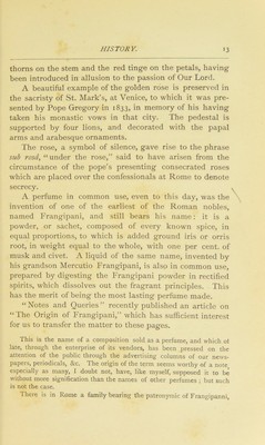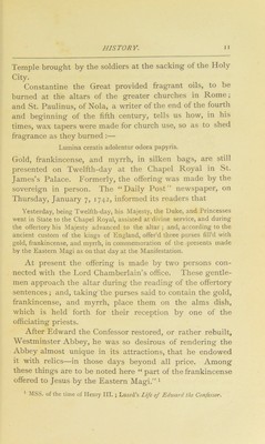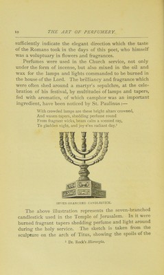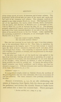 ![of the richest myrrh, of cassia, of cinnamon, and of sweet calamus. The proportions of the mixture were 500 parts of the myrrh and cassia, and 250 each of the cinnamon and calamus. This ointment could not be applied to any other purpose (Exod. xxx. 20-33). The Septuagint names one of the ingredients, the myrrh, (r/iipvris iKKeKTijs, which corresponds with the myrrh, fjtvpov fiapvrifiov, of Matthew (xxvi. J), described as ro^v- TiK-fis by Mark (xiv. 3), and as roxlniiios by John (xii. 3). The ointment probably prepared for Lazarus, which his sister Mary poured on the head and body of our Lord, consisted therefore of one only of the four ingre- dients of the sacred oil in use in the first Temple. Judas reprehended this anointing, as practised at banquets, as an extravagant luxury. So Martial (III. xii. 4) says :— “ Qui non coenat et ungitur, Fabulle, Hie vere mihi mortuus videtur.” This view was corrected by our Lord, who says it was done prepara- tory to his entombment (Mark xiv. 8). Thus Jahn, in explaining the above passages in the Gospels, says ;—“ It was their custom to expend upon the dead aromatic substances, especially myrrh and aloes, which were brought from Arabia. This ceremony is expressed by the Greek verb ivTatpidCeiv [to embalm or entomb], and was performed by the neigh- bours and relations.” In the other case (Luke vii. 37) the myrrh was only applied to the feet of our Lord after washing, and previous to partaking of a meal—a common practice of antiquity, and once performed by our Lord himself to his disciples ; when, however, no mention is made of anointing, it being probably too costly for general use. At Sparta, the selling of per- fumed ointments was wholly prohibited ; and in Athens, men were not allowed to engage in it. Different ointments were used for different parts of the body.—Eschenburg, iii. s. 170. Gibbon ^ says ;— In a magnificent temple, raised on Palatine Mount, the sacrifices of the god Elagabalus (the sun) were celebrated, with every circumstance of cost and solemnity. The rarest aromatics were profusely consumed on his altar. Horace [Carminum, 3, 14), in an ode celebrating the return of Augustus from Spain, bids his slaves go and seek for perfumes, and desires the tuneful Neaera to make haste and collect into a knot her scented hair. These passages ^ Decline a7td Fall, vol. i. chap. vi. p. 234.](https://iiif.wellcomecollection.org/image/b28050009_0031.jp2/full/800%2C/0/default.jpg)