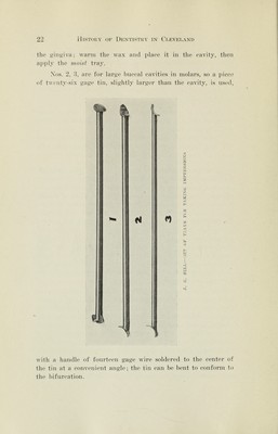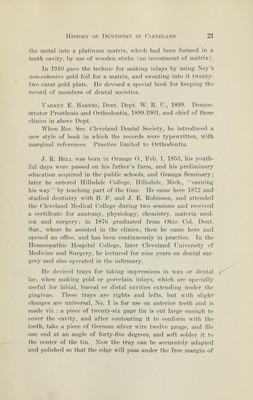 ![the metal into a i)latinuiii matrix, wliidi had heen formed in a tootli cavity, by use of wooden sticks (no investment of matrix). In 1910 «iave the teehnic for makinu iidays ])y using Ney's non-colicsive liold foil for a matrix, and sweating into it twenty- two carat gold plate. lie devised a speeial ))ook for keeping the record of menibei's of dental societies. VwiSKY E. Barnes, Dent. Dept. W. R. IT., 1899. Demon- strator Prosthesis and Orthodontia, 1899-1901, and chief of these clinics in above Dept. AVhen Rec. Sec. Cleveland Dental Society, he introduced a new^ style of book in ^vhich the records were typewritten, with marginal references. Practice limited to Orthodontia. J. K. Bell was ])orn in Orange O., Feb. 1, 1858, his youth- ful days were passed on his father's farm, and his preliminary education acquired in the public schools, and Geauga Seminary; later he entered Hillsdale College, Hillsdale, ]\lich., earning his Avay hy teaching part of the time. He came here 1872 and studied dentistry with B. F. and J. E. Robinson, and attended the Cleveland ^Medical College during two sessions and received a certificate for anatomy, physiology, chemistry, materia med- ica and surgery; in 1876 graduated from Ohio Col. Dent. Sur., where he assisted in the clinics; then he came here and opened an office, and has been continuously in practice. In the HonKPopathie Hospital College, later Cleveland University of IMedicine and Surgery, he lectured for nine years on dental sur- gery and also ojierated in the infirmary. He devised trays for taking impressions in wax or dental ^ lac, when making gold or porcelain inlays, which are specially useful for labial, buccal or distal cavities extending undei' the gingivae. These trays are rights and lefts, but with slight changes are universal, No. 1 is for use on anterior teetli and is made viz.: a piece of twenty-six gage tin is cut large enough to cover the cavity, and after contouring it to conform with the tooth, take a piece of German silver wire twelve gauge, and file one end at an angle of forty-five degrees, and soft solder it to the center of the tin. Now the tray can be accurately adapted and polished so that the edge will pass under the free margin of](https://iiif.wellcomecollection.org/image/b2120326x_0025.jp2/full/800%2C/0/default.jpg)