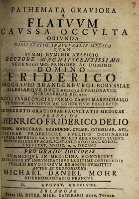 Pathemata graviora a flatuum caussa occulta oriunda dissertatio inauguralis medica ... / [Michael Daniel Mohr].