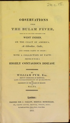 Observations upon the bulam fever which has of late years prevailed in the West Indies, on the coast of America, at Gibraltar, Cadiz, and other parts of Spain : with a collection of facts proving it to be a highly contagious disease / by William Pym, Esq.