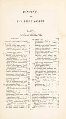 ![CONTENTS OF THE FIRST VOLUME. PART I. PHYSICAL GEOGRAPHY. CHAPTER I. a KOLOG Y. —MINERALOGY.—GE MS. Page I. Geyieral Aspect. Singular beauty of the island . 3 Its ancient renown in conse- quence 4 Fable of its “perfumed winds” (note) 4 Character of the scenery . . 5 II. Geographical Position ... 6 Ancient views regarding it a- mongstthe Hindus,—“the Me- ridian of Lanka ”, . .6 Buddhist traditions of former submersions . . . (note) 7 Errors as to the dimensions of Ceylon 8 Opinions of Onesicritus, Erato- sthenes, Strabo, P]iny,Ptolemy, Agathemerus . . . . 8,9 The Arabian geographers . . 9 Sumatra supposed to be Ceylon (note) 10 True latitude and longitude . 11 General Fraser’s map of Ceylon (note) 11 Geological formation . . .12 Adam’s Bridge . . . .13 Error of supposing Ceylon to be a detached fragment of India . 14 III. The Mountain System . . 14 Remarkable hills, Mihintala and Sigiri 15 Little evidence of volcanic action 16 Rocks, gneiss . . . .16 Rock temples . . . .17 Laterite or “ Cabook ” . .17 Ancient nameTamba-panni (note) 17 Coral formation . . .19 Extraordinary wells . . .21 Darwin’s theory of coral wells examined . . . (note) 22 The soil of Ceylon generally poor 24 “ Patenas,” their phenomena ob- scure 24 Rice lands between the hills . 26 Soil of the plains, “ Talawas ” . 27 Page IV. Metals.—T\n . . .29 Gold, nickel, cobalt . . .29 Quicksilver . . . (note) 29 Iron ...... 30 Y. Minerals.—Anthracite, plumbago, kaolin, nitre caves . . .31 List of Ceylon minerals . (note) 32 YI. Gems, ancient fame of . . 32 Rose-coloured quartz . . (note) 33 hlode of searching for gems . 34 Rubies . . . . .36 Sapphire, topaz, garnet, and cinnamon stone, cat’s-eye, amethyst, moonstone . 37, 38 Diamond not found in Ceylon (note) 38 Gem-fmders and lapidaries . 39 YII. Rivers.—Their character . . 40 The Mahawelli-ganga . . '41 Table of the rivers . . .41 VIII. Singular coast formation, and its causes . . . .43 The currents and their influence 44 Word “ Gobb ” explained 44, (note) 46 Vegetation of the sand forma- tions 48 Their suitability for the coco- nut 51 IX. Harbours. — Galle and Trinco- malie . 52 Tides .... . . 0 2 Ited infusoria . 53 Population of Ceylon . . 53 CHAP. II. CLIMATE.—HEALTH AND DISEASE Uniformity of temperature . . 54 Brilliancy of foliage . . . .56 Colombo.—January—longshore wind 56 February—cold nights . . (note) 57 March, April . . . . .68 May—S.W. monsoon . . .68 Aspect of the country before it .59 Lightning . . . . .60 Rain, its violence . . . .61 June ....... 62 3](https://iiif.wellcomecollection.org/image/b29352800_0001_0011.jp2/full/800%2C/0/default.jpg)