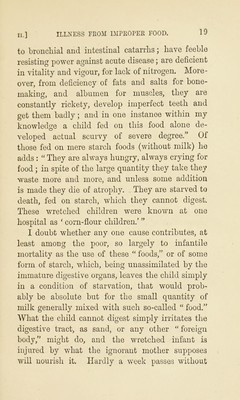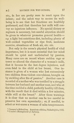 ![II.] etc., ill her are pretty sure to react upon the infant; and the safest way to secure its well- being is to see that her functions are healthily performed, and that therefore her milk will con- vey no injurious influence. No special dietary or regimen is necessary, but careful attention should be given to whatever promotes general health— e.g. a light but nutritious diet, including plenty of well-cooked vegetables or ripe fruit, moderate exercise, abundance of fresh air, etc. etc. Not only is the nurse’s physical health of vital importance, but it is most essential that her mind should be quiet and undisturbed by passion. Many cases are on record where sudden rage or terror so altered the character of a wmman’s milk, that it became to the last degree injurious, and even fatal to the child at her breast. One in- stance is given of a woman who lost successively two children from violent convulsions, brought on by suckling after fits of passion.^ Another case is recorded of a mother who was terrified by a struggle between her husband and another man, and who at the time suckled a child, perfectly healthy till then, with the result that it died within a few minutes, while still at the breast.^ After these warnincfs o it is clear that no mother can be too careful to preserve her own equanimity; or, if needful, to select as wet-nurse a woman of calm temperament. I Cazeaux’s Midwifery. American edition, riuladelRhia, 1857. * Cembe’s Management of Infancy. Q](https://iiif.wellcomecollection.org/image/b28717776_0037.jp2/full/800%2C/0/default.jpg)
