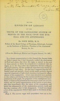 On the effects of lesion of the trunk of the ganglionic system of nerves in the neck upon the eyeball and its appendages / by John Reid.