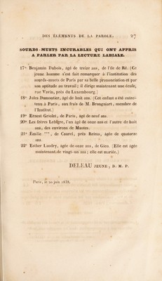 Nouvelles recherches physiologiques sur les éléments de la parole qui composent la langue française, et sur leur application à une nouvelle dactylologie alphabétique et syllabique pour l'éducation des sourds muets / [Nicolas Deleau].