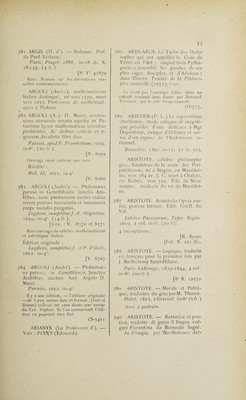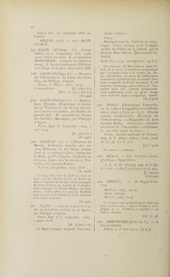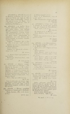 ![APULEIUS où APULEE (Lucius) de Madaure, en Afrique, ne vers 114, mort vers îa fin du règvne de Marc Aurèle. Initie et Philosophe Platoni¬ cien, qui fut accusé de Magie. Son « Ane d’Or » est imité de celui de LUCIUS de PATRAS. q. v. 350 APULEIUS. —L. Apuleii Mada- vrensis, philo,sophi Platonici, opéra, quæ extant omnia, cum Philippi Beroaldi in Asinum Aureum eruditis- simi commentariis : rccensq. Godel- calci Stewcchi Heusdani in L. Apu¬ leii opéra omnia quæstionibus et conjecturis, nec non aliorum doc- torum virorum in eundem cmenda- t ion i bu s adjectis. Lugduni, sumptibus Si b a Por¬ ta, 1587, 2 vol. pet. in-8°. (12 fr.). Edition rare avec les commentaires de Philippe Béroalde. Autres éditions : Lugduni, in officina H. a Porta... 1004. 2 voL in-8. [ R. q 335 “4 L. Apuleii Opéra quæ quidem ex- tant Omnia. Basil cor per Henriami Pétri, 1 360 '2 vol. in-8. [R. 0327 et 9329 (S-4453 351 APULEE. — Œuvres complè¬ tes comprenant : Les Florides. — Du Démon de Socrate. — De la Doc¬ trine de Platon. — Traité du monde. Apologie. — L’ànc d’or (roman ini¬ tiatique). Le même volume contient le licencieux Satyricon, de Pétrone et les Nuits attiqu-es d’Aulu-Gelle. Tra¬ duction Nisard. Paris, 1842, gr. in-8°(io fr.). [4° Z. 941 Toute la philosophie du fameux magi¬ cien Apulée se trouve reunie dans cette traduction, avec le texte latin. C’est la seule édition complète, enrichie de notes très savantes. 352 APULÉE. — Œuvres complètes traduites en français par V. Bétolaud. Paris, Garnier, 188; 2 vol. in-12. (5 fr.). L’édition originale est de : Paris, C. L. Pauckoueke, 183 ^-38 4 vol. in-8. Bibl. Pnnckoucke (Tomes 44-47) [Z. 1*777-80 (C-552 353 APULEIUS.— L’Ane d'or; avec le Démon de Socrate [par Apulée] trad. par Compain de Saint-Martin. Paris, 17^6. 2 vol. in-12 [R. 9360-61 LL traduit par J. A. Maury. Paris, Bastion, 1822, 2 vol. in-80, (8 fr.). Illustré d'un portrait et de 40 figures gravées, au trait. [IL 9364-65 (O-1814 (G-1661 354 APULEE. — Les Métamorphoses, ou l’Ane d’Or d’Apulée, traduit par J. de MONTLYARD. Paris, 16; i, in-8. Figures de Crisp de Paz. Autres éditions : Paris, Brunet, 1707, 2 vol. in-12 Francfort, et Leipzig, 1709, 1 fort vol. in-12. Paris, Bas!'eu, 1787, 2 vol. in-8° Paris, Didier, 1824. 1 vol. in-iS. Paris, Didol, 1872.gr. in-8 (S-4142 333 APULEIUS. — L’Ane d'or ou la Métamorphose. Paris, 1736, 2 vol. in-12. Le livre XI est entièrement consa¬ cré aux initiations. [R. 0300-61 (O-i 92 350 APULÉE. — L’esprit familier de Socrate, traduction nouvelle avec des remarques par le Baron des Coutures. Paris \B. Girin?] /J02, in-12, (10 fr.). IR- 9375 Apulée, philosophe platonicien, ne traite pas dans cet ouvrage du Dieu de Socrate mais de son Démon, espèce de divinité qui était si étroitement attachée à lui, qu’elle l’avertissait ordinairement de faire une chose ou de s’abstenir quand elle devait lui être fâcheuse. C’est la même édition que : Paris, B Girin, 1698, in-12. [R. 9374 [8° R. 5721](https://iiif.wellcomecollection.org/image/b31359498_0001_0127.jp2/full/800%2C/0/default.jpg)