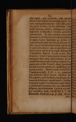 ![6A. | alie nigris , alis puniceis, aliz aureis]. Nonne vel folum Zerezrzgum, quod vo4[ cant, variegatum Marmor teítis effe pote-T. 7, rit, quod exhibet Turres diftin&as cum[ ^ ruinis arbores , Urbes, aliasque res quafi] fon ingeniofi & feliciffimi Pi&oris penicillo nin adumbratas. Et vidi lpfemet cum meis pon itinerum fociis Florentiz in fumtuofiffimo | 4 &regias Gazas fuperante ad Jdem D.['/l Laurentii adjun&o Sacello,in íummo Al-| hn, tari, quod San&um San&orum vocabanc[! ^ & operelithoftroto (quodopus Mufivum Vut Mufivarium aut utex antiquis. Epitaphiis| Seis TPÍGHIlSin Hercul. Prodic. p.526. Mun féiarium, vulgó à lamo(aique, vocant ) ex[ 6. variegato Marmore elaborabatur, £» z4-| pul t£uralis Marmoris fruftro nulla accedente hu-T* ftri mana arte àfolá Naturá duos homines [10 baculo botrum portantes exa&iffimé de- liaeatosfuifle. | Sic refertJoh. 70NSTON. | Iv Thaumatograph. S. IV. c. 17. tempore pi. Joh. Friderici Ele&. Saxon. effoffum fu. ft] ifle Lapideyi, qui Chriftum crucifixum, Jo- hannem & Mariam reprzíentarit. Pariter inventos Lapides Pontificium caput tripli- i ci diademate ornatum, nec non Monachi! hi Hung effigiem repraíentantes Lineis& colori- bus atteftatur Andr. LIB.AVIUS L. V. de. Biluminib. fchol.ad c.35. p. 703. ubi p. | | 794 |](https://iiif.wellcomecollection.org/image/b32991873_0072.jp2/full/800%2C/0/default.jpg)