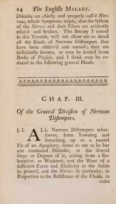 Credit: The English malady: or, a treatise of nervous diseases of all kinds, as spleen, vapours, lowness of spirits, hypochondriacal, and hysterical distempers, &c. In three parts. ... : with the author's own case at large / by George Cheyne. Source: Wellcome Collection.