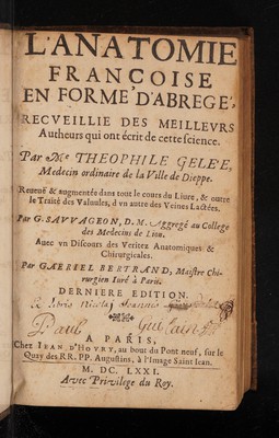 L'anatomie françoise en forme d'abregé, recueillie des meilleurs autheurs qui ont écrit de cette science / ... Reveuë & augmentée dans tout le cours du livre, & outre le Traité des valvules, d'un autre Des veines lactées ... par G. Sauvageon ... Avec un discours des veritez anatomiques & chirurgicales. Par Gaeriel [sic] Bertrand.