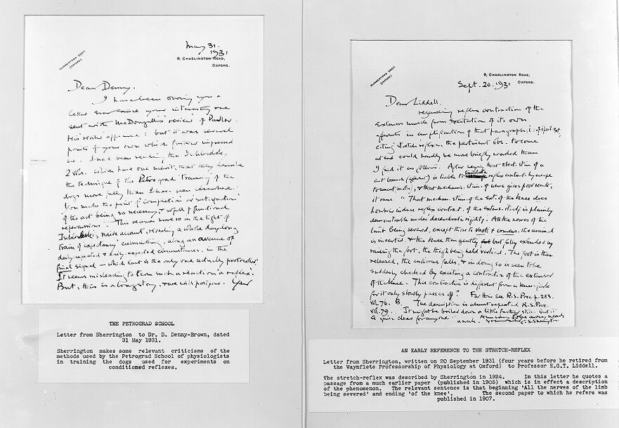 Credit: M0016238: Display board: letter from Sherrington to Derek Denny-Brown, 31 May 1931 / M0016239: Display board: letter from Sherrington to Edward G.T. Liddell, 20 September 1931. Source: Wellcome Collection.