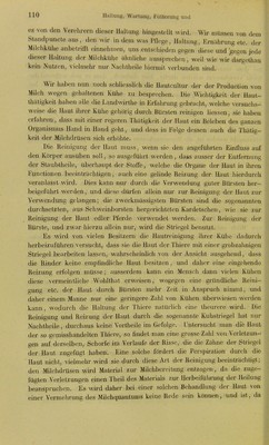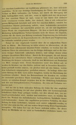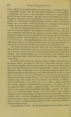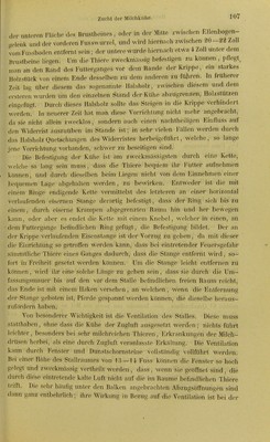 ![dor unteren Flüche des Brustbeines , oder in der Mitte zwischen Ellenbogcn- izelenk und der vorderen Fusswurzel, und wird hiernach zwischen 20—22 Zoll vom Fussboden entfernt sein; der untere würde hiernach etwa 4 Zoll unter dem Brustbeine liegen. Um die Thiere zweckmässig befestigen zu können, püegt, man an den Rand des Fulterganges vor dem Rande der Krippe, ein starkes Holzstüek von einem Ende desselben zu dem anderen zu führen. In früherer Zeit lag über diesem das sogenannte Halsholz, zwischen diesem und dem ersteren AA^irden um den einzelnen Stand der Kühe abzugrenzen, Ilolzstützen eingefügt. Durch dieses Halsholz soUte das Steigen in die Krippe verhindert werden. In neuerer Zeit hat man diese Vorrichtung nicht mehr angebracht, da sie nicht allein zwecklos, sondern auch einen nachtheiligen Einfluss auf den Widerrist auszuüben im Stande ist; in sehr vielen Fällen werden durch das Halsholz Quetschungen des Widerristes herbeigeführt, welche , so lange jene Vorrichtung voi'handen, schwer zu beseitigen sind. Die Befestigung der Kühe ist am zweckmässigsten durch eine K-ette, welche so lang sein muss, dass die Thiere beqüeto ihr Futter aufnehmen können, und durch dieselben beim Liegen nicht von dem Einnehmen einer ])equemen Lage abgehallen werden, zu bewirken. Entweder ist die mit einem Ringe endigende Kette vermittelst des letzteren an einer horizontal verlaufenden eisernen Stange derartig befestigt, dass der Ring sich bis zu einem, durch eiserne Krampen abgegrenzten Raum hin und her bewegen kann, oder aber es endet die Kette mit einem Knebel, w'elcher in einen, an dem Futtergange befindlichen Ring gefügt, die Befestigung bildet. Der an der Krippe verlaufenden Eisenstange ist der Vorzug zu geben, da mit dieser die Einrichtung so getroffen werden kann, dass bei eintretender Feuersgefahr sämratliche Thiere eines Ganges dadurch, dass die Stange entfernt wird, so- fort in Freiheit gesetzt werden können. Um die Stange leicht entfernen zu können, wird ihr eine solche Länge zu geben sein, dass sie durch die Um- fassungsmauer bis auf den vor dem Stalle befindlichen freien Raum reicht, das Ende ist mit einem Haken versehen, an welchen, wenn die Entfernung der Stange geboten ist, Pferde gespannt werden können, die dieselbe heraus- zufordern haben. Von besonderer Wichtigkeit ist die Ventilation des Stalles. Diese muss stallhaben, ohne dass die Kühe der Zugluft ausgesetzt werden; nichts führt leichter, besonders bei sehr milchreichen Thieren, Erkrankungen der Milch- diHsen herbei, als eine durch Zugluft veranlasste Erkältung. Die Ventilation kann durch Fensler und Dunstschornsteine vollständig vollführt werden. Bei einer Höhe des Stallraumes von 13 —U Fuss können die Fenster so hoch gelegt und zweckmässig vertheilt w^erden , dass , wenn sie geöffnet sind, die durch diese eintretende kalte Luft nicht auf die im Räume befindlichen Thiere Iriftl. Die sehr häufig unter den Balken angebrachten AbzugsÖlTnungen sind dann ganz entbehrlich; ihre Wirkung in Bezug auf die Ventilation ist bei der](https://iiif.wellcomecollection.org/image/b21717655_0117.jp2/full/800%2C/0/default.jpg)