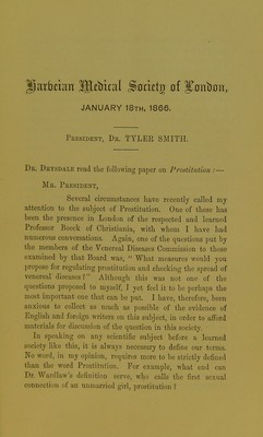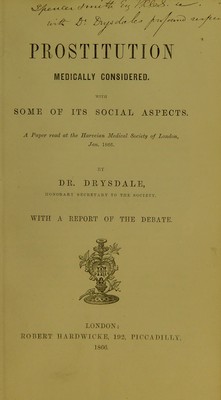 Prostitution medically considered : with some of its social aspects : a paper read at the Harveian Medical Society of London, Jan. 1866 / by Dr. Drysdale ; with a report of the debate.