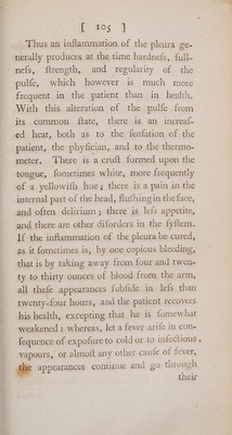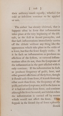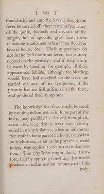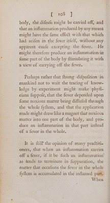 ![- eS eet, TO, ae ee eee Pee ae [> 508 =] body, the difeafe might be carried off, and that an inflammation produced by any means might have the fame effect with that which had arifen in the fever itfelf, without any apparent caufe excepting the fever. He might therefore produce an inflammation im fome part of the body by ftimulating it with a view of carrying off the fever. Perhaps rather that ftrong difpofition in mankind not to wait the tracing of know- ledge by experiment might make phyfi- cians fuppofe, that the fever depended upon fome noxious matter being diffufed through the whole fyftem, and that the application made might draw like a magnet that noxious matter into one part of the body, and pro- duce an inflammation in that part inftead of a fever in the whole. It is {till the opinion of many practiti- oners, that when an inflammation carries matter that occafions the fever in the whole When](https://iiif.wellcomecollection.org/image/b33086321_0114.jp2/full/800%2C/0/default.jpg)