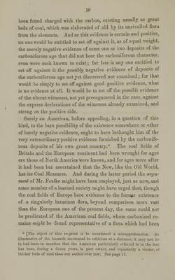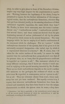 ![discovery must be immediately proved to be harmonious with certain other portions of our knowledge. A due regard to the sacredness of religious faith and to the natural sensitiveness of the popular mind will secure respectful caution ; but it is most consistent with the acknowledged imperfection of human facul- ties, and at the same time most worthy of the true dignity of science, to assume that ultimately all truths will be found to agree ; and meantime, strictly adhering to the canons of evi- dence, to explore courageously the great field open to us. We ought especially to avoid generalizations which have no sound philosophical principle, or which are framed or applied merely from a desire to appease over-zealous minds ignorant of the facts already ascertained. This obligation is stronger in proportion to the degree of confidence given to the teacher in any case, and also in proportion to the limitation of access to other sources of information. THE TESTIMONY OP THE ROCKS, OR GEOLOGY IN ITS BEARINGS ON THE TWO THEOLOGIES, NATURAL AND REVEALED. By Hugh Miller. Author of The Old Red Sandstone, Footprints of the Creator, &c. &(. Boston : Gould & Lincoln. 1857. INote onpagn iVl, 172, 173, 174, 175.] It will be seen that there is no attempt made in this lecture to represent the great Palaeozoic division as characterized throughout its entire extent by a luxuriant flora. It is, on the contrary, expressly stated here, that the plants of its earlier and terminal formations {i. e. those of the Silurian, Old Red, and Permian Systems) were feiv and small, and that it was only during the protracted eons of the carboniferous period that they received their amazing development, unequalled in any pre- vious or succeeding time. Being thus express in my limitation](https://iiif.wellcomecollection.org/image/b21141150_0008.jp2/full/800%2C/0/default.jpg)