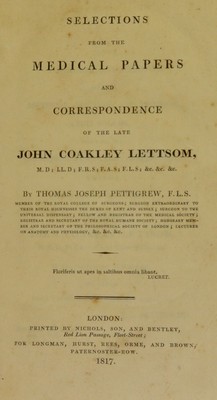 Selections from the medical papers and correspondence of the late John Coakley Lettsom,... / by Thomas Joseph Pettigrew.
