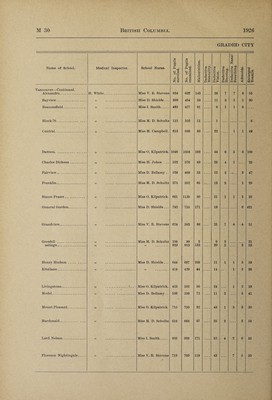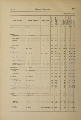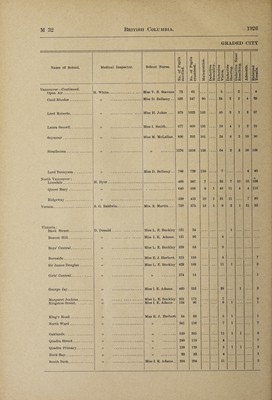 ![M 32 British Columbia. 192G GRADED CITY Name of School. Medical Inspector. School Nurse. No. of Pupils enrolled. No. of Pupils examined. Malnutrition. Defective Mentality. Defective Vision. Defective Hearing. Defective Nasal Breathing. Adenoids. Enlarged Tonsils. II Vancouver—Continued. H. White. ... Miss V. B. Stevens 73 61 5 i • • . 2 . i . . 4 Miss D. Bellamy .. 583 547 90 i . . . 24 2 2 4 29 Miss H. Jukes .... 979 1023 183 45 • 3 2 3 87 Miss I. Smith. 577 600 135 19 4 1 2 21 Miss M. McLellan. 896 392 101 24 8 2 18 90 1276 1316 126 64 2 3 16 106 Miss D. Bellamy .. 746 729 110 7 • 4 40 North Vancouver : • H. Dyer. 466 387 7 .... So 7 10 10 108 Queen Mary. II ... . • • ... 640 508 8 1 48 11 4 4 113 Ridgeway. 539 453 10 1 31 11 .... 7 90 Vernon........ S. G. Baldwin. Mrs. S. Martin- 750 375 12 1 9 2 1 31 53 Victoria: D Donald Miss Ti. F.. Buckley 131 34 1 Miss T. E. Adams. 131 92 4 Miss ]j. E. Buckley 339 58 3 Miss E. J. Herbert. 215 158 - 4 7 Miss L. E. Buckley 429 188 11 1 3 374 54 1 George Jay. II .*.. 4 .. Miss I. E. Adams.. 460 253 .... .... 38 . . . 1 .... 3 Miss L. E. Buckley 301 172 7 6 Miss T. E. Adams.. 134 96 6 1 1 Miss E. J. Herbert 84 83 5 1 1 341 116 7 1 7 539 385 11 1 1 8 280 119 4 7 138 129 5 1 1 2 28 32 4 1](https://iiif.wellcomecollection.org/image/b31411897_0042.jp2/full/800%2C/0/default.jpg)
