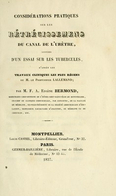 Considérations pratiques sur les rétrécissemens du canal de l'urètre : suivies d'un essai sur les tubercules, d'après les travaux cliniques les plus récens de M. le professeur Lallemand / par M.F.A. Eugène Bermond.