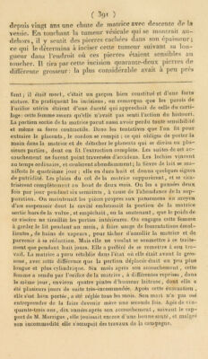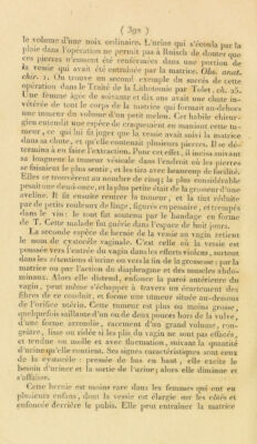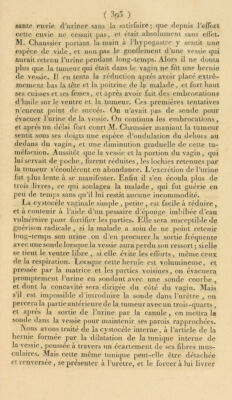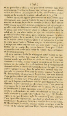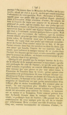 ![passage ? On trouve dans le Mémoire de Verdier sur I» * ohir. t. 4, p. S7, un fait qui semUeTumZ; amauve de cette question. Noël, chirurgien à Orléans Une PjîitC fiI!C (iui sou,rrait depuis plusieurs loi\ lb!!/ 01!6 -temi0n taurine fut surpris de peu muf de poule, qui lui sembla être une pocbe qui apereevoi^dannalre’ «. •«» parois trés-minces laissaient ' fi™SJa Cav,tc lme *«q«e«r limpide. La malade découvrit' iv,m™t quelques heures après, «oèl couvnt par i ouverture du cadavre, que les uretères “ SV r‘<|ue lenr Calibrc celui de l'in- Lentrée du'v L ■OUVrU flUe la lnmmr à ment de V • etait U?e poc,ie CIU1 contenait véritable- ment de 1 urine Pour rendre raison de ee lait, il dit que une'ra re'enUC ^ Urette »u dans lès deux, ,ar vessie T r ,0UC]1 de CCS condllits daùs’la P? enfoncer la tunique interne de ce viscère dans \i0 (,cs femmes qui est court, et très-extensible ; qu’elle peut la pousser au-dehors , et former extérieurement la po- tJie urinaire dont il est question. . Qnojqu l\ sort Possd)le que la tunique interne de la ves- sie se détaché de la tunique nerveuse et musculaire , qu’elle soit prolongée du côté de l’urètre , et qu’elle sorte par le mcat urinaire - cependant on conçoit difficilement que l’u- rine retenue par une pierre ou. par une autre cause, a inseition ( e uietere dans la vessie, puisse opérer celte séparation et le prolongement de cette tunique interne : or- dinairement l’urine s’amasse au-dessus de l’obstacle en dila- tant urctere , le bassinet et les calices du rein, qu’elle dé- sorganise et transforme en une poche membraneuse d’un volume plus ou moins considérable. Un examen plus at- teuti , ou une exposition plus détaillée des rapports et de la manière d’être de cette tumeur urinaire avec la vessie, aurait été nécessaire pour enlever les doutes, et instruire sur sa nature et sa formation. Cette tumeur pouvait être une hydatide formée dans la tunique interne de la vessie, et prolongée hors de l’urètre ; elle pouvait être un renversement de cette tunique près du col de ce viscère pai relâchement. Iloin a connu une fille d’environ vingt- cinq ans, souvent incommodée de rétention d’urine , et](https://iiif.wellcomecollection.org/image/b28745620_0001_0408.jp2/full/800%2C/0/default.jpg)