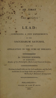 An essay on the effects of lead: comprising a few experiments on the saccharum saturni, and its application in the cure of diseases ... / [Thomas Semmes].