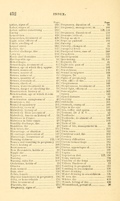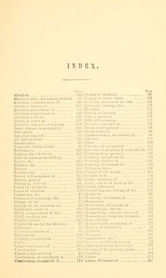 ![Tngc Labor, signs of 260 Labor, stages of 263 Labor, ads-ice concerning 280 Lacing Ill Leucorrhea 429 Leucorrhea, treatment of 429 Light, solar, effects of 118 1 iniiir, swelling of 194 Liquor ainnii 264 Lochia, the 337 Lochia] discharge, the 336 Long ng 2114 Marks and blemishes 2(18 Marriageable age 34 Menorrhagia 81 Menorrhagia, treatment of 8. Menses, age at which the} appear. 37 Menses, names of 4') Menses, source of 42 Menses, nature of 4:51 .-hippen, Di .85 Pregnancy, duration of Pregnancy, management in 108 118,123 Pregnancy, disorders of 132 Pressure, evils of 112 Prolap us uteri 430 Pruri us pudendi 193 Puberty j4 Puberty, changes at 35 Puerperal fever 34-2 Puerperal (ever, case of 348 Purgatives 220 Quadrigemini 31? Quickening 95, IOC Raynold, Dr 21 Wight side, pain of 19L Salivation 182 Sea-sickness 1'A6 Sexual indulgence Menses, quantity of 46 Menses, cessation of 4H Menses, check of 61 Menses, water-treatment in 64 Menses, danger of checking the... 79 Menstruation, history of 34 Menstruation, age at which it com- mences 37 Menstruation symptoms of 40 Membranes, the 273 Mental despondency 20] Midwifery, ca«-es in 383 Midwifery, history of 19 Midwifery, Bible account of 19 Midwifery. American history of... 24 Midwives in France 23 Mid wives in Bible times 29 Monthly discharge, the 40 Monthlies, the 40 Milk tubes, the 371 Miscarriage, or abortion 143 Mi carriage, prevention of 147 Miscarriage, recurrence of 149 Morning sickness 133, 1(6 Nausea and vomiting in pregnancy 132 Navel, healing of 300 Nervousness 200 New Zealanders, habits of 30 Nipple, the 371 Nippies, sore 36:2 Nur.ing 308 Nursing, rules for 310 Otaheitans, habits of 29 Ovaries 240 Pain, natural 256 Pain, after 328 Pelvis, female 23(1 Physical hindrances in pregnancy. 191 Piles, or hemorrhoids ]7( Signs of pregnancy >kin. office of the Sleeplessness Sleeplessness, treatment of Solar light, effects of Sore nipples Spices Spinal diseases ty 149 24 92 113 166 107 118 362 150 12 224 Still-birth 301 Stomach, cramp of 186 Stye in the eye 181 Tea, coffee and spices 150 Tennant, Dr J B. V 25 Toothache 187 Toothache, treatment of 188 Triplets 316 Turn of life 49 Turn of life, management in 53 Twins 316 Twin cases 322 Umbilical cord, the 292 U ret bra 232 Urinary difficulties 185 Uterine hemorrhage 162 Uterus 234 Uterus, appendages of 238 Vaccination 197 Vagina 233 Vegetarian diet 127, 158 Veins, varicose 194 Viability of the fetus 103 Yilliers. Duchess of 23 Vomiting in pregnancy 132 Vomitiug in sea-sickness 136 Water drinking 129 Water drinking in sea-sickness 136 W ters. the 264 Whites, the 429 Piles, treatment of 177 I Womb, falling of the 430 Placenta, the 272 I Womanhood, period of 3d Pregnancy, signs of SSI](https://iiif.wellcomecollection.org/image/b21004055_0432.jp2/full/800%2C/0/default.jpg)