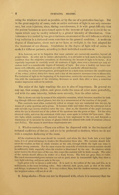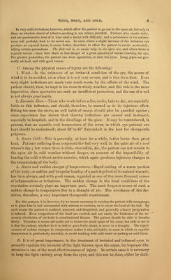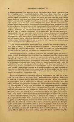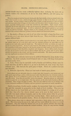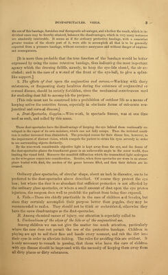 ![the use of this bandage, furnishes real therapeutic advantages, and whether the result, which in in- dividual cases may be thereby attained, balances the disadvantages, which in very many instances are absolutely intolerable. It seems as if the ordinary protective bandage, with a somewhat greater tension of the elastic part of it, were able to accomplish all that is to be generally expected from a pressure bandage, without excessive annoyance and without danger of unpleas- ant consequeuces. [It is more than probable that the true function of the bandage would be better expressed by using the name retentive bandage, thus indicating the most important agency which the dressing fulfills, namely, to keep the eye-lids closed, the air ex- cluded ; and in the case of a wound of the front of the eye-ball, to give a splint- like support.] 2. The effects of dust upon the conjunctiva and cornea.—Working with dusty substances, or frequenting dusty localities during the existence of conjunctival or corneal disease, should be strictly forbidden, since the mechanical contrivances used for excluding dust fail to accomplish the purpose. [This rule must not be construed into a prohibition of outdoor life as a means of keeping active the nutritive forces, especially in obstinate forms of sub-acute con- junctiva] and corneal disease.] a. Bust-Spectacles, Goggles.—Wire-work, in spectacle frames, was at one time used as such, and culled by this name. These dust-spectacles have the disadvantage of keeping the eye behind them continually en- veloped in the vapor of its own moisture, which can not fully escape. Thus the irritated condi- tion is rather increased than diminished. The principal reason for their disuse lies, however, in the impairment of distinct cision, which compels the patient to strain his eyes severely in order to see surrounding objects distinctly. By the wire-work considerable objective light is kept away from the eye, and the frame of the dust-spectacles places the translucent gauze in an unfavorable angle to the outer world, thus limiting the visual field. Moreover the manifold diffraction which the transmitted light undergoes on the wire gauze comes into consideration. Besides, when these spectacles are worn in an atmos- phere loaded with dust, the meshes of the gauze become filled, and then their defects are in- creased. Ordinary glass spectacles, of circular shape, about an inch in diameter, are to be preferred to the dust-spectacles above described. Of course they protect the eye less; but where the dust is so abundant that sufficient protection is not afforded by the ordinary glass spectacles, or where a small amount of dust upon the eye proves injurious, the surgeon does well to prohibit the patient from being thus exposed. I. Veils.—These are chiefly practicable in the case of children and females, but since they certainly accomplish their purpose better than goggles, they may be recommended to males. They should not be thick or embroidered, otherwise they have the same disadvantages as the dust-spectacles. B. Among chemical causes of injury, our attention is especially called to 1. Uncleanliness of the edges of the lids or of the conjunctival sac. Among children we can not give the matter too much attention, particularly where the case does not permit the use of the protective bandage. Children in playing are apt to soil their face and hands every moment, and rub the dirt into their eyes in order to alleviate itching. The rules for avoiding this are evident. Jt is only necessary to remark in passing, that those who have the care of children with eye disease should be impressed with the necessity of keeping them away from all dirty places or dirty substances.](https://iiif.wellcomecollection.org/image/b2107902x_0025.jp2/full/800%2C/0/default.jpg)