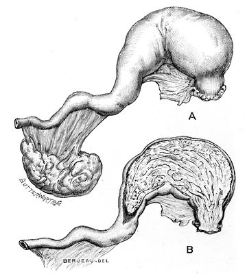 Credit: M0019692: Illustration of an ampulla of a fallopian tube occupied by a carcinoma, 1922. Source: Wellcome Collection.