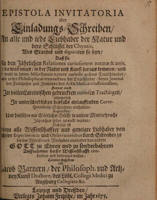 Epistola invitatoria oder Einladungs-Schreiben, an alle und iede Liebhaber der Natur und dero Schlüssel der Chymie, wes Standes und Dignitäten sie seyn, dass sie zu den jährlichen Relationes curiosorum Naturae & Artis, so da was neues, in der Natur und Kunst heraus kommen, etc / [Jacob Barner].