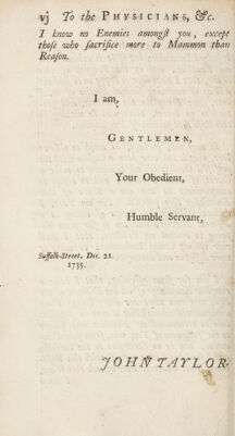 A new treatise on the diseases of the chrystalline humour of a human eye: or, of the cataract and glaucoma. With a new a theory of their causes, and an endeavour to demonstrate that there are no membranous cataracts; but that all cataracts are from an alteration of the chrystalline humour itself. With an exact description of a new and more successful method of making the operations necessary to the removal of the several species of these diseases. Humbly address'd to Her Majesty. To which is prefix'd, a Letter to the Physicians and Surgeons of London and Westminster ... / by John Taylor.