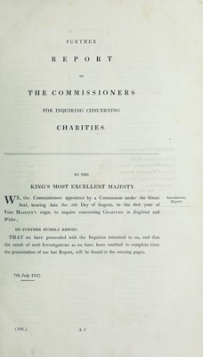 Report of the Commissioners appointed in pursuance of two several acts of Parliament; the one, made and passed in the 58th year of His late Majesty, c.91, intituled, "An Act for appointing Commissioners to inquire concerning Charities in, England, for the Education of the Poor"; and the other, made and passed in the 59th year of His late Majesty, c.81. intituled, "An Act to amend an Act of the last session of Parliament, for appointing Commissioners to inquire concerning Charities in England, for the Education of the Poor, and to extend the powers thereof to other Charities in England and Wales".