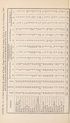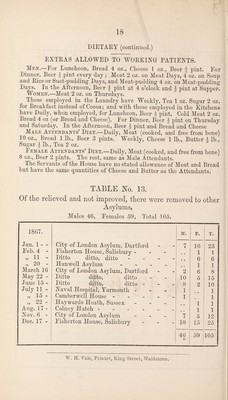 ![DIETARY (continued.) EXTRAS ALLOWED TO WORKING PATIENTS. Men—For Luncheon, Bread 4 oz., Cheese 1 oz., Beer § pint. For Dinner, Beer f pint every day ; Meat 2 oz. on Meat Days, 4 oz. on Soup and Rice or Suet-pudding Days, and Meat-pudding 4 oz. on Meat-pudding Days. In the Alternoon, Beer | pint at 4 o’clock and § pint at Supper. Women.—Meat 2 oz. on Thursdays. Those employed in the Laundry have Weekly, Tea 1 oz. Sugar 2 oz. for Breakfast instead of Cocoa; and with those employed in the Kitchens have Daily, when employed, for Luncheon, Beer | pint, Cold Meat 2 oz. Bread 4 oz (or Bread and Cheese). For Dinner, Beer § pint on Thursday and Saturday. In the Afternoon, Beer \ pint and Bread and Cheese Male Attendants’ Diet.—Daily, Meat (cooked, and free from hone) 10 oz., Bread 1 lb., Beer 3 pints. Weekly, Cheese 1 lb., Butter \ lb., Sugar | lb., Tea 2 oz. I emale Attendants’ Diet.—Daily, Meat (cooked, and free from bone) 8 oz., Beer 2 pints. The rest, same as Male Attendants. The Servants of the House have no stated allowance of Meat and Bread but have the same quantities of Cheese and Butter as the Attendants. TABLE No. 13. Of the relieved and not improved, there were removed to other Asylums, Males 46, Females 59, Total 105. 1867. M. F. T. Jan. 1 - - City of London Asylum, Dartford 7 16 23 Feb. 4 - Fisherton House, Salisbury - • • 1 1 » 11 - Ditto ditto, ditto - 6 6 „ 20 - Hanwell Asylum - • • 1 1 March 16 City of London Asylum, Dartford 2 6 8 May 22 - Ditto ditto, ditto 10 5 15 June 15 - Ditto ditto, ditto - 8 2 10 J uly 11 - Naval Hospital, Yarmouth - 1 1 „ 15 - Camberwell House ----- ] 1 „ 22 - Haywards Heath, Sussex - 1 1 Aug. 17 - Colney Hatch. 1 1 Nov. 6 - City of London Asylum - 7 5 12 Dec. 17 - Fisherton House, Salisbury 10 15 25 46 59 105 W. H. Vale, Printer, King Street, Maidstone.](https://iiif.wellcomecollection.org/image/b30308434_0020.jp2/full/800%2C/0/default.jpg)