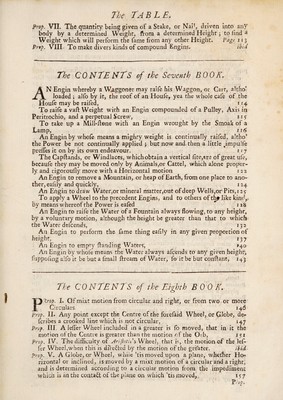 ![greater part of the Weight, and that which Is further, the Me* part, pro* portionally to the Diftance reciprocally, Page 49- Prop. XVII. Powers confining at tne Ends of a Leaver, do not hear the Weight eafier on the longer Leaver, than on the fhorter, y.j Prop. XVIIL While two Powers fuftain a Weight whofe Centre is above the Leaver, in a declined Site, the lower Power bears the greater Weight, ibid. Prop. XIX. When a Power draws by a Line oblique to the Leaver, its true f)iftance is a Perpendicular from the Prop to the Line of Dire£tion, 51 The CONTENTS of the Third BOOK. OF the Wheel, or Axis, in Perkrochio, ^ Page fj Prop. I. The Wheel, or Axis, in Peritrochio is a Balk nee or Leaver, 58 Prop. II. While a Power að by the Force of its own Gravity, the In- creafe of the Power doth not always ought to be required from the Di¬ stance of the Axis, 6z Prop. III. Of the Windlace placed vertically, 63 Prop. IV. Of the Double Wheel, or Axis, in Peritrochio, 6$ Prop. V. Of Wheels with Cogs, or 'teeth, 67 Prop. VI. To re call Toothed Wheels to the Leaver, 69 The whole Multiplication of a Power by help of Wheels is eafie to re*cal] to Leavers: Yea, he that diligently eonfiders the Nature of Wheels, may eafily confider the perpetual Leaver in them*, for each Cog of the Wheel is a Leaver, which are fubftituted to themfelves by turns; fo that one being deficient, another fucceeds it, ibid. Prop. VII. Of Engines moved by Water, 70 Among others, thofe Engines are moll ufeful, which are rather moved by inanimate things than by Animals, becaufe that inanimate things want not Nourifliment, and are never tired or wearied, ibid. Prop. VIII Of Engins that work by the Gravity #f Weights, 72 Prop. IX. Engines moved by Smoak, 75 Prop. X. Of Engines working by the Wind, ibid. The Art of Mills depends on Axis in Peritrochio, 74 The CONTENTS of the Fourth BOOK. OF the Pulley, Pag S3 Prop. I. A fingle immovable Pulley neither adds nor diminifhes Force,#. Prop. II. A Power is eafily applied by a fingle immovable Pulley, 84 Prop. III. Large Pulleys are moll ufeful, 85 Prop. IV. A Man may take up a Weight heavier than himfelf with a fingle immovable Pulley, 86 Prop. V. Many immovable Pulleys neither increafe nor diminifli the Force of a Power, 87 Prop. VI. A Weight hung to a movable Pulley, its half part is diminiflied, ibid. Prop. VIE A Power applied to a movable Pulley diminilhes an half part, in refpett of a Weight hung on one end of a Rope, 88 Prop. VIII. If to move the Wheels of a Dial,or Clock,for 12 Hours there he -. v a & required](https://iiif.wellcomecollection.org/image/b30500035_0013.jp2/full/800%2C/0/default.jpg)