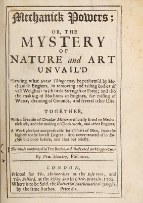 Mechanick powers; or, The mystery of nature and art unvail'd ... Together, with a treatise of circular motion artificially fitted to mechanick use, and the making of clock-work, and other engines ... The whole comprized in ten books, and illustrated with copper cuts / By Ven. Mandey, Philomat [and J. Moxon].