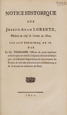 Notice historique sur Joseph Adam Lorentz, Médecin en chef de l'Armée du Rhin, lue le II Germinal, An IX / par le cit. Thomassin.
