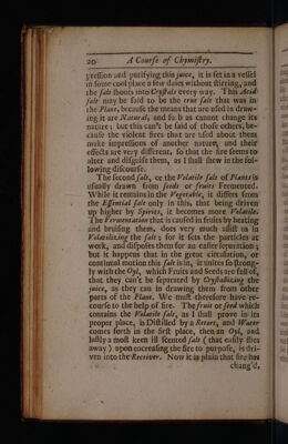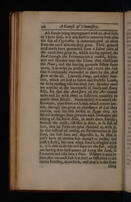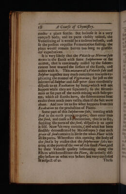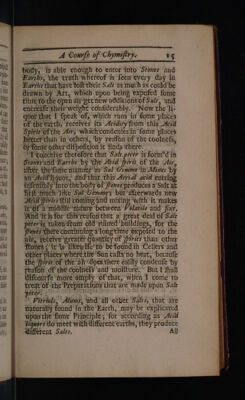 ![Vtans aWUL Es =, « <> #F « paae SS ee Fe FS — <_> — ae ©> — “ — . _ a 3 = 5 - —— § ~ = > ae = = =! . a € —J 5 ’ f— SL OE ET ET FT TSE SS SILT SE ETD = — = —— = —- ——— — _ 4 Compe of Chymifiry: body, is able enough to enter into Stowes and Earths, the truth whereof is feen every day in Earths that have toft their Salt ‘as much as could’be drawn’ by Att,’ which upon being expofed fome tile to-the Open dir‘pet'new additions of Sait, and encredfe their'weight confiderably.° ‘Now the ‘li- quor'that I fpeak ‘of, which rans in fome ‘places of the earth, ‘recetves its Acsdiry'from ‘this Acid Spirit’of the Air, ~which'condenles in ‘fome ‘places better than in ‘others, ‘by redfon of ‘the coolnefs, br fonie other difpofition it ‘finds ‘there. ‘Tconceive therefore that Szh_perer is form?d'in Stones'and Earths by ‘the Acid ‘fpirit, of the Air, dfret the’fatite nianner' as Sal 'Gemime ih Mines by an’ Acid liquor, dtid-that ‘this Aerial acid ‘entring infentibly ‘inco'the’bouy of jroves produces a‘Salt at firft ‘much like ‘Szl/Gemme; bit ‘afterwards new Acid piries Till comibg and mixing “with ‘itmakes it’ Of 4 ‘middlenature ‘between Volatile and‘ fixe. Whd ‘itis for’ this’reafon that a’ preat deal of Sale peters taken from old ‘ruined’ buildings, for ‘the froues *thete continuing’ long time éxpofed ‘to’ the ftones } it ‘is likewife’ to’ befound ih ‘Cellers and ‘other places‘where-the Sun cafts'no heat, ‘becaufe the ‘pivit’of the air does there éafily condenfe ‘hy reafon_of the coolnéfs and ‘moifture.~ But I thall diftontfe ‘more atiply “ofthat, when I come to treat ‘of the' Preparations that’are’ made upon Sal rer, aig I Pibvials: Alums, ‘and all othet ‘Salts, ‘that are naturally found ‘in the Earth, ‘may be explicated upon the'fame Principle; ‘for according as Acid lignors do meet with different earths, they produce different Salts. Al]](https://iiif.wellcomecollection.org/image/b30326618_0001_0055.jp2/full/800%2C/0/default.jpg)