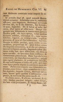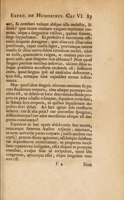 ![, Exerc. de Humoristrs, Car. VI. 8| «ri, & comburi valeant abfque ulla moleftia, & fenfu? quas tamen multum exigunt nutrientis ma¬ teriei , idque a fanguineis vafibus , quibus fcatent, large fuppeditatur. Et profe&o fi nutritionis offi¬ cium fanguini denegatur, quis alius erit illius ufus potiffimus, cujus caufsa fagax , providaque natura coadta fit illius univerfalem circuitum moliri, adeo ut nulla, quantumvis exigua, ac minima pars cor¬ poris adiit, quas fanguine non abluatur? Non quod languis partium motibus inferviat, idcirco illius u~ bique praebentia neceflaria credenda eft: fufficeret enim, quodfanguis ipfe ad mufculos deferretur § qux fola, certaque funt cujuslibet motus inftru- menta. Non quod idem fanguis aliorum omnium fit pa¬ rens fluidorum corporis, ideo ubique permeare co- a£his eft, ut debitis in locis determinata fluida pro^ prio ex penu edudta relinquat5 fiquidem certa funt* ac ftatuta loca corporis, in quibus liquidorum de¬ politio fieri debet. Ad haec igitur fola confluere deberet: cur & alia petit? cur univerfim Ipargitur* diffunditurque ? cur adeo necellarius ubique elt lan* guinis commeatus ? Equidem in hoc opere abfolvendo huc natura^ naturasque. fummus Auftor refpexit , nimirum* ot cum univerfie partes corporis [nulla quidem ex* cepta] perenni fluxu agitentur, aifiduaque fiibftan* tiae deperditione exinaniantur, ac propterea inceft fanti reparatione indigeant, effiet aliquid in promptu omnibus, a cujus flnu id reciperent, quod libi congruum, aptumque efletj idque fangumis mu* mus eft.](https://iiif.wellcomecollection.org/image/b30525573_0091.jp2/full/800%2C/0/default.jpg)
