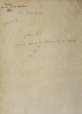 Georgii Ernesti Stahlii Negotium otiosum, seu Skiamachia, adversvs positiones aliqvas fvndamentales, Theoriae verae medicae à viro quodam celeberrimo [i.e. G.W. von Leibniz] intentata, sed adversis armis conversis enervata ... Qui possunt, si volunt, judicanto; qui volunt, sed non possunt, abstinento / [Georg Ernst Stahl].