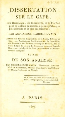 Dissertation sur le café; son historique, ses propriétés, et le procédé pour en obtenir la boisson la plus agréable, la plus salutaire et la plus économique / par Ant.-Alexis Cadet-de-Vaux... suivie de son analyse; par Charles Louis Cadet.