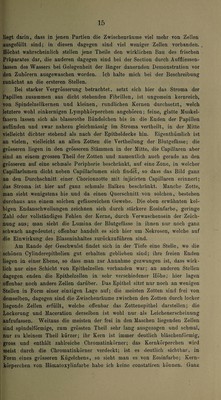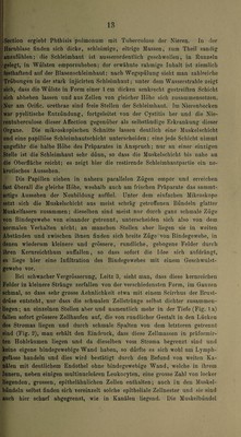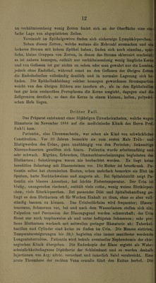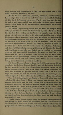 ![das Gleiche findet sich übrigens an den Kernen der in der Blasenwand eingelagerten Epithelnester, so dass hier nicht etwa eine Degeneration des Kernkörperchens durch Einwirkung des Harns vorliegen kann. Die Spindel- - förmigen Epithelzellen sind 10-, ja 30mal länger als breit. Hie und da sieht man offenbar Querschnitte von dicht an einander gelegenen Spindel¬ zellen, das heisst Gruppen von kleineren, polyedrischen Feldern, die fast ganz von den anscheinend rundlichen Kernen eingenommen werden; hie i und da auch ein solches kleines, polyedrisches Feld ohne Kern, ein Bild, welches vollständig an den Querschnitt durch Bündel glatter Muskelfasern erinnert; nur dass die Dimensionen der Zellen und Kerne ein wenig grösser sind. Die Spindelzellen wiegen weitaus vor; viel spärlicher sind protoplasma¬ reiche Zellen von mehr compacter Gestalt, wie es scheint voluminöser als die Spindelzellen, polymorph, im Ganzen aber 4eckig und etwas in die Länge gestreckt, so dass man manche derselben als kurze, aufgebauchte Spindeln bezeichnen könnte; ihr Kern ist breiter als der der Spindelzellen, oval, hell, blasser, enthält weniger Chromatinkörner; Kernkörperchen habe ich in diesen nicht deutlich gesehen; das Protoplasma ist feinkörnig; dann und wann liegen diese Zellen auch in kleinen Gruppen, 6—8 dicht beisammen, meistens i sind sie aber ebenso von einander isolirt wie die Spindelzellen. Dann und wann sieht man in einer dieser Zellen unverkennbare Theilungsfiguren, we- I nigstens Doppelsterne an den beiden Enden einer länglichen Zelle gelegen, i durch feine farblose Linien mit einander verbunden; in der Mitte zwischen den Doppelsternen ist eine leichte Einziehung der ganzen Zelle, an welcher \ man deutlich erkennt, dass diese Linien dichter zusammen treten. Unter den polymorphen Zellen bemerkt man dann namentlich noch I einige Elemente, welche etwas grösser sind wie die anderen, bei schwacher ] Vergrösserung schon durch stärkere Eosinfarbe ausgezeichnet, sowie durch i einen besonders dunklen, eigenthümlich gestalteten, maulbeerförmigen Kern i und ein grobkörniges Protoplasma; ich komme auf sie weiter unten bei Be- | sprechung der Zelleinschlüsse zu reden. Vorzugsweise die polymorphen Zellen zeigen auch Modificationen, die ! alie höchst wahrscheinlich entweder auf vitale Nekrose oder auf postmortale 1 Maceration zu beziehen sind; in letzterer Weise können am besten aufge¬ fasst werden jene Zellen, in denen das Protoplasma nicht mehr scharf be- j grenzt ist, blass wird, mit körniger Grenze; es nimmt an Menge ab und i umgiebt schliesslich den Kern nur in Form eines undeutlichen und unregel¬ mässig angeordneten körnigen Saumes; dann sieht man auch freie Kerne, * deren Protoplasma also vollständig zerstört ist; die Kerne werden dabei j blasser, verarmen, wie es scheint, an Chromatin und auch die Intensität der j Färbung nimmt ab; hie und da finden sich auch Bilder, welche als farblose j Kerne gedeutet werden können. Ueber die Anordnung dieser Elemente lässt sich nur vermuthungsweise i äussern, dass die mehr polyedrischen Formen die oberflächlichsten Lagen ; eines geschichteten Epithels gebildet haben möchten; es ist dies zunächst i ein Schluss, welcher sich mit Wahrscheinlichkeit aus ihrer Form ergiebt und](https://iiif.wellcomecollection.org/image/b30587475_0018.jp2/full/800%2C/0/default.jpg)