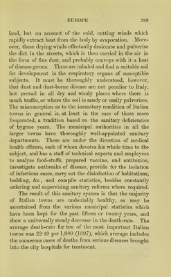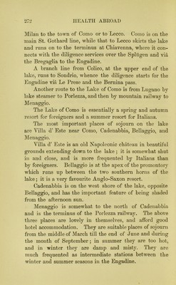 ![skirts the whole length of the eastern shore of the lake and goes on to Milan ; or from Lugano, by boat or carriage to Tresa, and then by tram railway to Luino, which is on the branch St. Gothard line above mentioned ; or from Milan and Como via Varese (see below) ; or, after crossing the Simplon to Domo d’ Ossola, by train to Gravelona and carriage to Pallanza. In fact there is a network of rail- ways connecting the lakes with each other, and with Milan and the south. Arona, 738 ft., is the railway terminus at the south end of the lake. To Milan, hours. Varese is an important intermediate station in spring for invalids coming from the south and from the Riviera and on their way to Switzerland ; in the autumn again it is a valuable intermediate station. There is a special station (Casbeno) on the line from Milan (2 hours), and Como to Laveno hour), for the Excelsior Hotel. The hotel is at an altitude of 1,200 ft. above the sea-level; it is situated in beautifully shaded grounds and is well appointed in every way (English physician in spring and autumn). There are golf links near the lake, about 2 miles from the hotel. This is one of the best interme- diate stations for invalids in Northern Italy. Entering Italy by the ]\Iont Cenis line, the traveller will probably be on his way south, for there is little to detain him in Turin. Turin is the fourth largest town in Italy, containing 350,000 inhabitants. Owing to the activity of the sani- tary authorities, to the broad open streets, and to the good water supply, it boasts a very low death-rate, viz. 16-99 per 1,000 for the year 1897. In this connection it may be remarked that the tramway service is so complete in Turin as to have reduced the carriage traffic in a remark- able degree, which fact doubtless contributes to the sani- tary excellence of the city.](https://iiif.wellcomecollection.org/image/b28139355_0294.jp2/full/800%2C/0/default.jpg)