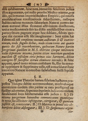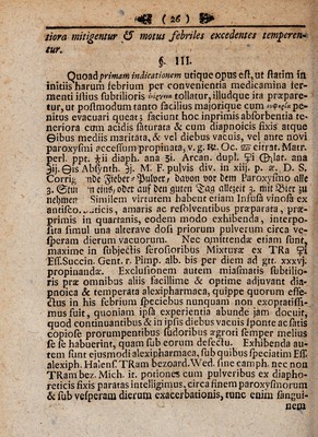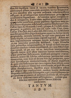 ![illos fed fepifltme vanos & vacuos vomitus fpontaneos, nimiumque iftum concernit,quoniam hacce fymptoma- ta prae omnibus aliis aegrotos ordinarie vehementillime affligunt & ad reliquorum exacerbationem principiem occafionem fuppeditant. Ad vomitus igitur compefcen- dos & mitigandos, fi tales ultra modum continuent mhi»- aue*prorfus exturbent, praeter pulveres digeltivos ante pa- roxyuuum aliquoties exhibendos,optimetonducunt Cort. Cafcar.Spec.de Hyacinth.CoraU.r.prarpar.& Cryhall. mont. nrxparat. in pulvere, nec non Eff. Gent. rubr. Cort. ©ant. Cafcar.TRa®\li cftis Ludov.Eff.Abf Comp.&c. in Mixturis tam fubparoxyfrao,frigoris tempore,quam in diebus vacuis propinandae, cavendo infimul, ne aegri tunc potulenta vel nimis frigida, vel nimis etiam copiofa ingerant. Mum au¬ tem impetuofiorem mitigant ommar acidulata, inpnmis sutas minerales potulentis inllillandi. Lapis Prunellae cum pulveribus temperantibus, & Syrupi aciduli cum po¬ tionibus ejusdem virtutis combinandi, nec non MRa fimpl. fine camph. ad gtt. xxx. vel xl. interdum interponenda'. Ouodii autem poft ufum omnium horum remediorum, atque peraflam fufficientem miafmatis peregrini evacua¬ tionem motus ifti febriles nihilominus pertinaciter con¬ tinuaverint, tunc licet ad fecura Febri fuga properare, quo¬ rum fpecialiorem enumerationem, ob chartae angufliam & quia talia fufficienter jam jam cognita funt,lubens nunc omitto & unicum faltem hoc commendo, ut pofi illorum ufum alexipharmaca, digeftiva atque ftomachica adhuc per aliquot dies continuentur, tandem laxatio moderata aliquoties ir.ftituenda fubjungatur,aegri a nimia ciborum in¬ gurgitatione arceantur, & quantum poffibile efi, ad regula- 6 ris disetae obfervationemadfiringantur; quippe qua: fola fere optimam praebet harum febrium ' medicinam. ‘ || TANTVM. ; — ] s. D' G. ' vj](https://iiif.wellcomecollection.org/image/b30776740_0028.jp2/full/800%2C/0/default.jpg)