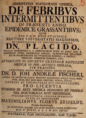 Credit: Dissertatio inauguralis medica, de febribus intermittentibus in praesenti anno epidemice Grassantibus ... / [Maximilianus Florus Ersfeldt]. Source: Wellcome Collection.